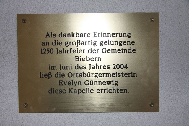 Von dem Standort der Kapelle an der Lehmkaul hat man einen besonders schönen Blick über Biebern. Aus Dankbarkeit für die gelungene 1250-Jahrfeier 2004 wurde der Bau der Kapelle durch die Ortsbürgremeisterin Evelyn Günnewig angeregt. Großzügige Spenden der Eheleute Alfons und Evelyn Günnewig machten den Bau der Kapelle erst möglich. Hoffentlich ist die Kapelle für viele Jahre und Jahrzehnte ein Ort der Besinnung und stillen Einkehr.